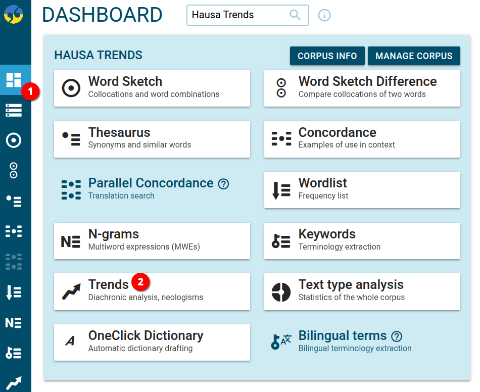 Sketch Engine offers a range of tools to work with this Hausa Trends corpus from news articles.