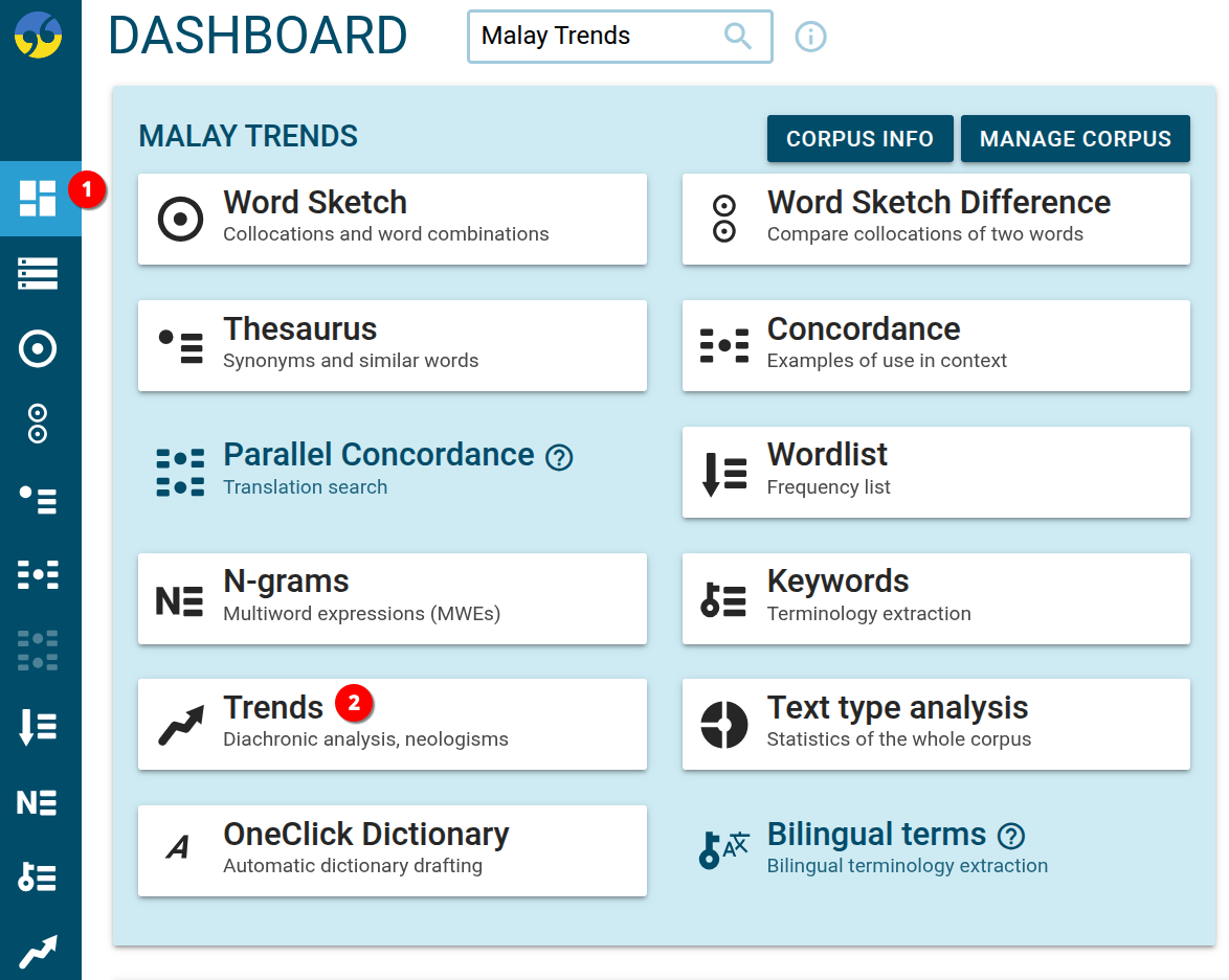 Sketch Engine offers a range of tools to work with this Malay Trends corpus from news articles.