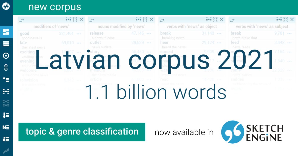 The new Latvian Corpus 2021 now available in Sketch Engine. The corpus is enriched with part-of-speech tagging and lemmatization.