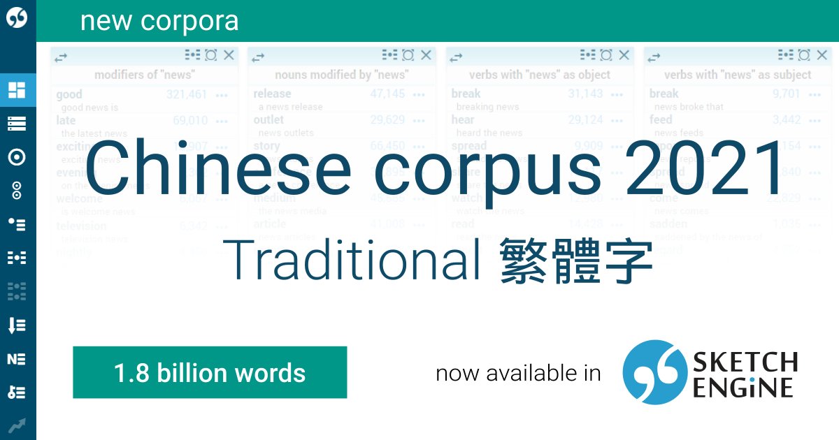 Our new Chinese corpus in Traditional Chinese (繁體字) is now available. It is part-of-speech tagged and partly annotated for topics and genres. A useful resource for research and language teaching.