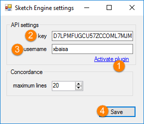 locating Sketch Engine in the ribbon at the top and selecting Settings - insert the API copied from Sketch Engine